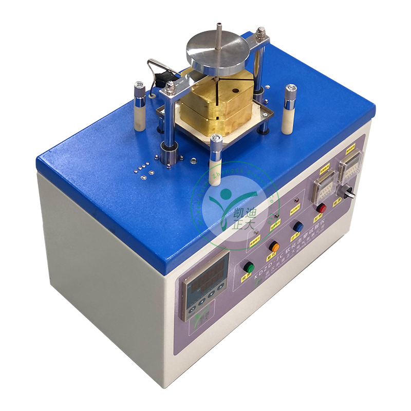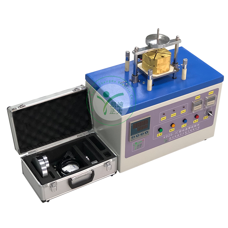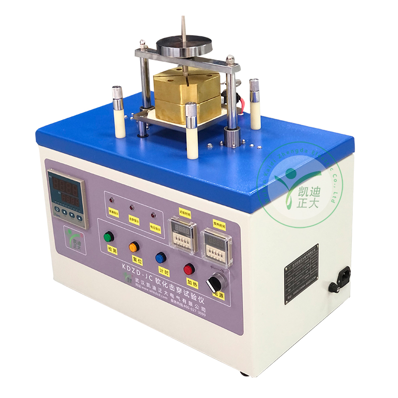 KDZD-JC軟化擊穿試驗儀用于檢測3.00mm及以下漆包線在熱狀態(tài)下漆膜軟化后的絕緣性能,根據(jù)設(shè)定的預(yù)熱溫度、試驗時間、儀器自動完成對試樣的預(yù)加熱、加負(fù)荷、加試驗電壓,達(dá)到試驗時間或試樣被擊穿時即卸負(fù)荷,發(fā)出聲光信號。該儀器采用熱電偶測溫,智能溫度控制,能自動調(diào)節(jié)和顯示試驗溫度、測試部分采用集成電路,整個測試過程自動完成。