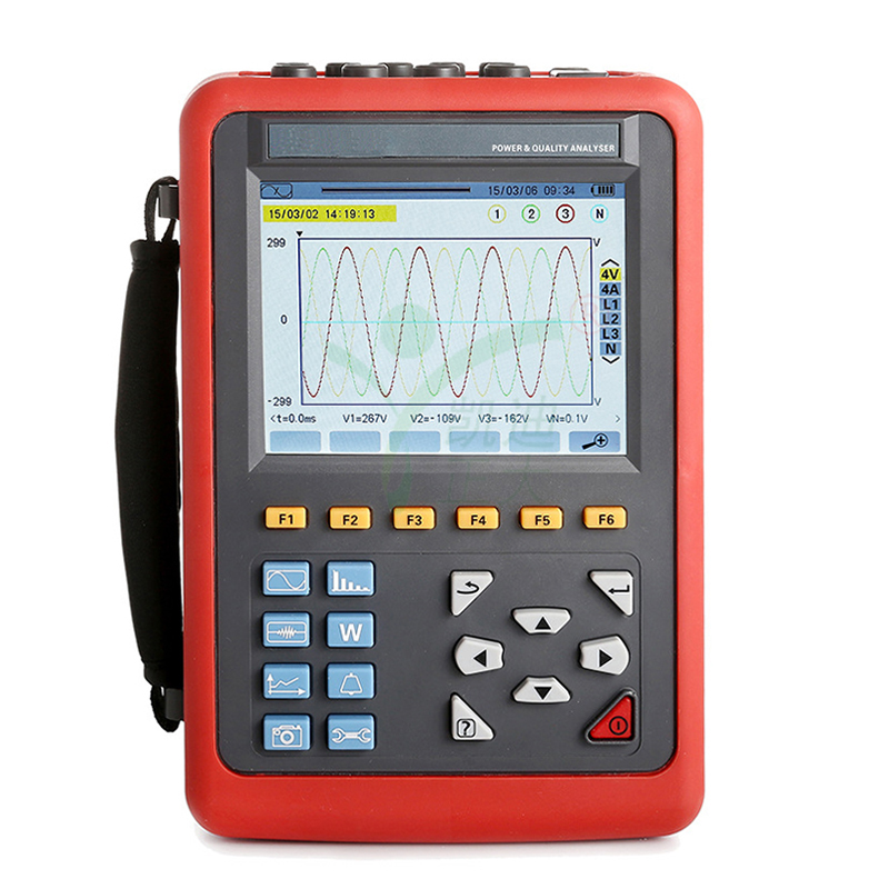 KDZD5000電能質量分析儀是我公司精心研制的現場測試的三相、多功能、智能化、人機操作簡潔的綜合型測試儀器。具有容易使用,超大液晶彩屏顯示,高分辨率,中英文雙語操作界面,防振結構外殼等特點。可同時測量4路電流(ABC三相及中性線電流),4路電壓(ABC三相電壓及中性線對地電壓)、電流電壓的峰值、一段時間內的最大最小值、三相不平衡度、短時電壓閃變、變壓器K因數、有功功率、無功功率、視在功率、功率因數、位移功率因數、有功電能、無功電能、視在電能、諧波比、總諧波失真度等;顯示電流電壓的實時波形、相量圖、諧波比柱形圖;動態捕捉電壓電流瞬時變化,監測啟動電流,監測各電力參數并生成告警列表,長時間記錄測試數據并生成趨勢曲線圖等功能。