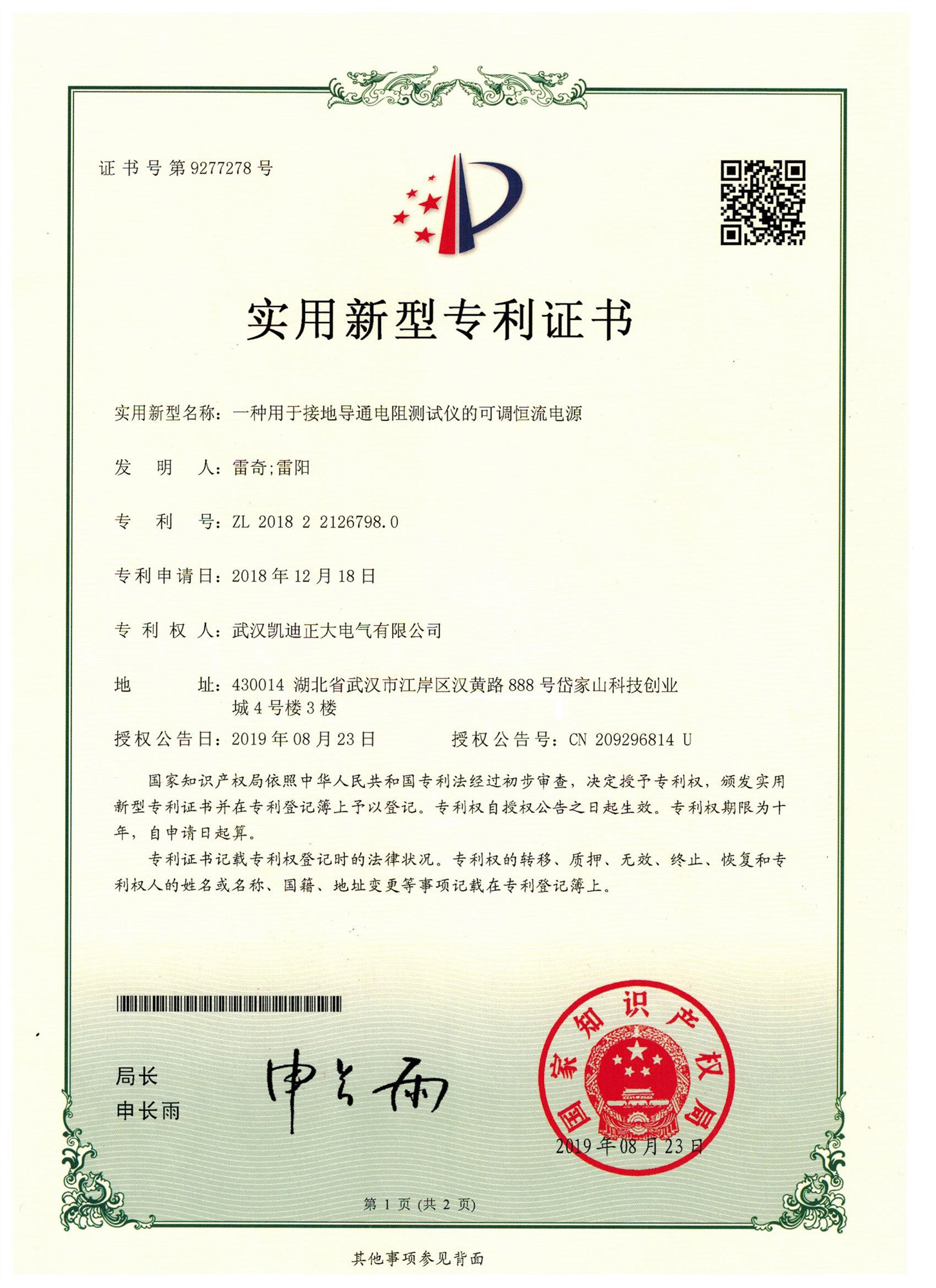 “KDHL-100A回路電阻測試儀”曾獲實用新型專利證書