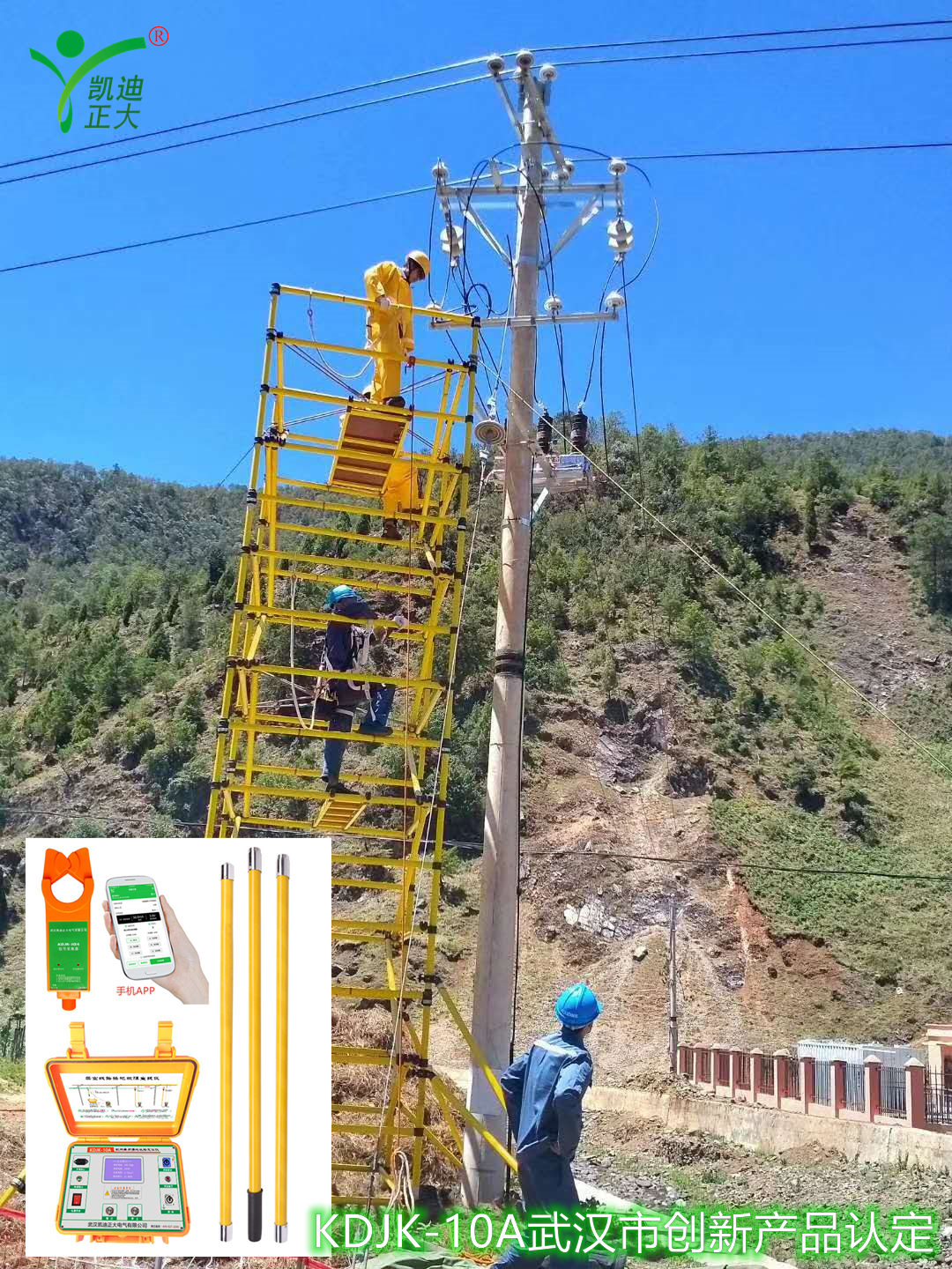 首先將故障線路的開關斷開;使用KDJK-10A測試地線用接地線與接地棒連接,接地棒接入大地網;信號輸出端子與高壓輸出測試線插頭端子連接,其另一端的線鼻子壓擰在接在絕緣掛線桿的蝴蝶母接線柱上,3根絕緣桿用短接線連接,再將掛線桿掛在故障線路上。