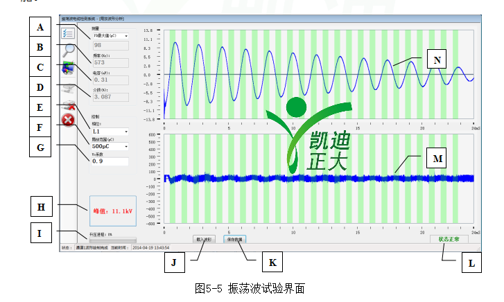K、數(shù)據(jù)保存按鈕 L、高壓單元狀態(tài) M、局放波形顯示區(qū)域 N、振蕩波電壓波形顯示