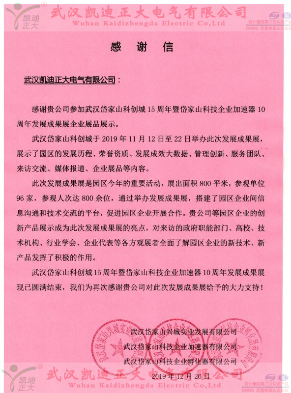 年關(guān)將至,凱迪正大公司收到一份來自岱家山科技企業(yè)加速器公司的感謝信,感謝我司的創(chuàng)新產(chǎn)品展示成為發(fā)展成果展的亮點。此次我司參展的創(chuàng)新產(chǎn)品有:KDHG-518B變頻互感器特性綜合測試儀、KDVLF-80kV超低頻交流耐壓試驗裝置、KDJB-1200微機繼電保護測試儀等設(shè)備。來訪的政府職能部門、高校、技術(shù)機構(gòu)、行業(yè)協(xié)會、企業(yè)代表等參觀者共同見證了我們公司新產(chǎn)品的新技術(shù)。