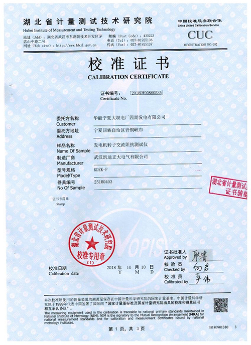 武漢凱迪正大KDZK-F發(fā)電機(jī)轉(zhuǎn)子交流阻抗測試儀校驗證書