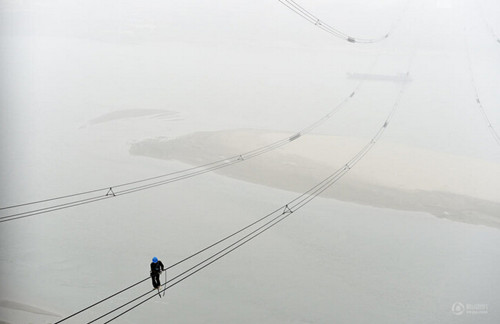 3月16日,國網(wǎng)湖北電力檢修公司鄂西北運(yùn)維分部的檢修工在漢江大跨越導(dǎo)線上進(jìn)行走線檢查。當(dāng)日,國網(wǎng)湖北電力檢修公司對位于湖北省鐘祥市磷礦鎮(zhèn)楊灣村的500千伏131號斗樊二回輸電線路漢江中山口大跨越進(jìn)行檢修。檢修工在距地面約122米的高空導(dǎo)線上行走,檢查各式高空電力設(shè)備運(yùn)行情況,并對隱患及時處理。新華社記者郝同前攝