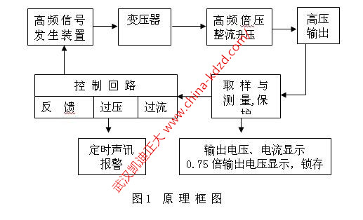 武漢凱迪正大KDZG系列直流高壓發(fā)生器采用中頻倍壓電路,率先應(yīng)用最新的PWM中頻脈寬調(diào)制技術(shù),閉環(huán)調(diào)整,采用了電壓大反饋,使電壓穩(wěn)定度大幅度提高。該發(fā)生器具有紋波系數(shù)小、輸出穩(wěn)定可靠,體積小、重量輕的特點,且具有可靠、靈敏的內(nèi)部保護(hù)功能,直流高壓發(fā)生器原理框圖如圖1所示。