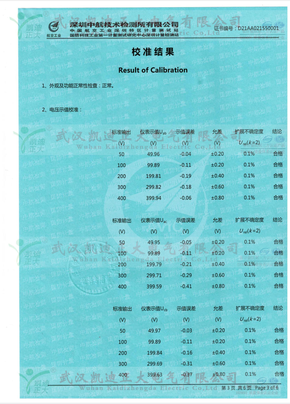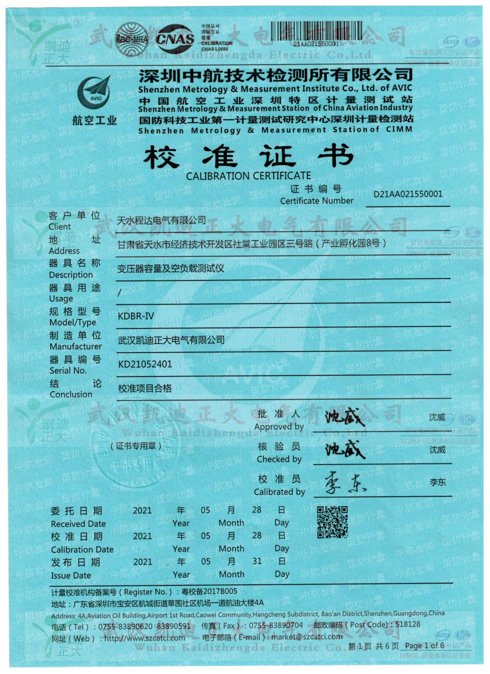 KDBR-IV變壓器容量及特性測試儀是我司老客戶天水程達(dá)電氣再次采購的,因多次為質(zhì)檢所等相關(guān)單位提供高低壓成套檢測設(shè)備,所以程達(dá)電氣對我司產(chǎn)品青睞。應(yīng)要求需要出具中國合格評定國家認(rèn)可委員會(CNAS)相關(guān)單位的電壓示值校準(zhǔn)、電流示值校準(zhǔn)、功率示值校準(zhǔn)等數(shù)據(jù)。深圳中航技術(shù)檢測大多數(shù)限公司(中國航空工業(yè)深圳特區(qū)計量測試站/國防科技工業(yè)第一計量測試研究中心深圳計量檢測站 )是航空工業(yè)北京長城計量測試技術(shù)研究所、國防科技工業(yè)第一計量測試研究中心于1986年投資建立的計量技術(shù)檢測服務(wù)機(jī)構(gòu),是深圳市最早的法定計量檢測機(jī)構(gòu)之一,是具有法定計量、國防計量、軍用計量屬性的第三方公正實驗室。