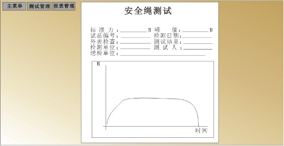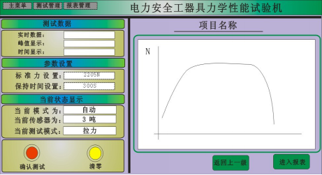 參數(shù)設(shè)置。這里要特別查看(當(dāng)前狀態(tài)顯示)的內(nèi)容,確認(rèn)是否是自動(dòng)模式,傳感器是否符合試驗(yàn)的量程,還有是否是拉力測(cè)試,確認(rèn)無(wú)誤后再做下面的事情;清零按鈕用于清除初始值。然后點(diǎn)擊確認(rèn)測(cè)試按鈕開(kāi)始測(cè)試,但系統(tǒng)力值到達(dá)設(shè)定值的20%時(shí),系統(tǒng)會(huì)自動(dòng)停止,此過(guò)程為預(yù)緊過(guò)程,若此過(guò)程有出現(xiàn)較大的變動(dòng),可能由于夾具沒(méi)夾緊,此時(shí)試驗(yàn)人員可根據(jù)具體的現(xiàn)象進(jìn)行檢查,若沒(méi)有問(wèn)題試驗(yàn)人員用鼠標(biāo)點(diǎn)擊繼續(xù)測(cè)試,設(shè)備繼續(xù)加載力值,測(cè)試數(shù)據(jù)欄中會(huì)顯示當(dāng)前狀態(tài)的受力情況,當(dāng)拉力力值達(dá)到設(shè)置的力值時(shí),開(kāi)始自動(dòng)計(jì)時(shí),設(shè)備開(kāi)始保持力,力值不過(guò)沖。同時(shí)右邊的實(shí)時(shí)曲線將記錄實(shí)時(shí)力值與時(shí)間的曲線。計(jì)時(shí)完成后設(shè)備自動(dòng)卸載力,關(guān)閉電磁閥,關(guān)閉油泵,測(cè)試結(jié)束。鼠標(biāo)點(diǎn)擊進(jìn)入報(bào)表按鈕進(jìn)入報(bào)表界面。