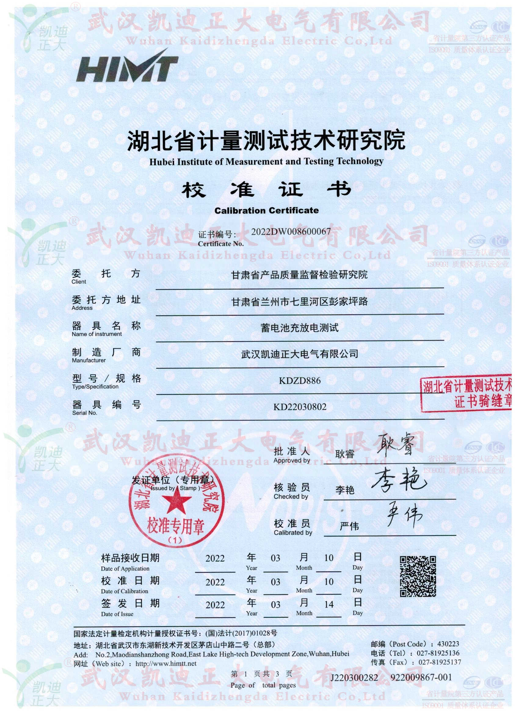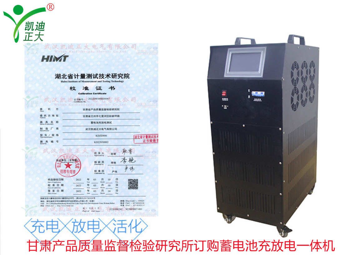 甘肅省產(chǎn)品質(zhì)量監(jiān)督檢驗(yàn)研究院在了解我司KDZD886蓄電池充放電測試儀集蓄電池恒流放電,智能充電,活化于一體等功能。隨即采購KDZD886蓄電池充放電測試儀,要求獲得湖北省計(jì)量測試技術(shù)研究院的檢定合格報(bào)告。