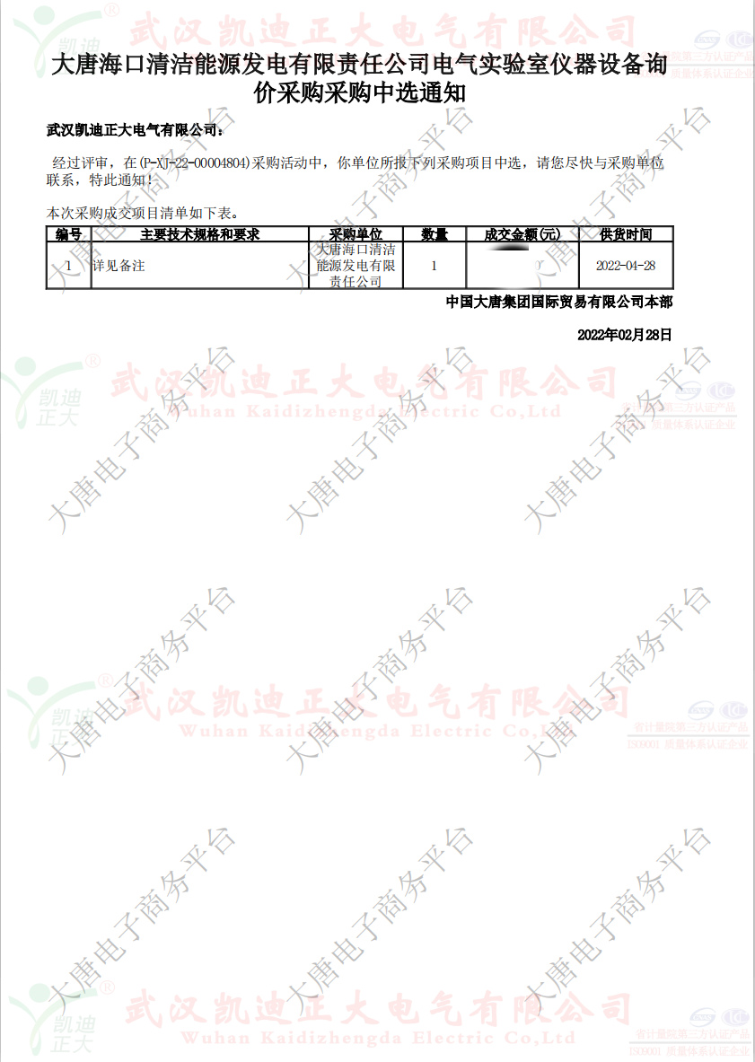 遲日江山麗,春風(fēng)花草香。祝賀我司商務(wù)部再次接到中國(guó)大唐海口清潔能源發(fā)電有限責(zé)任公司電氣實(shí)驗(yàn)室儀器設(shè)備詢價(jià)采購采購中選通知。