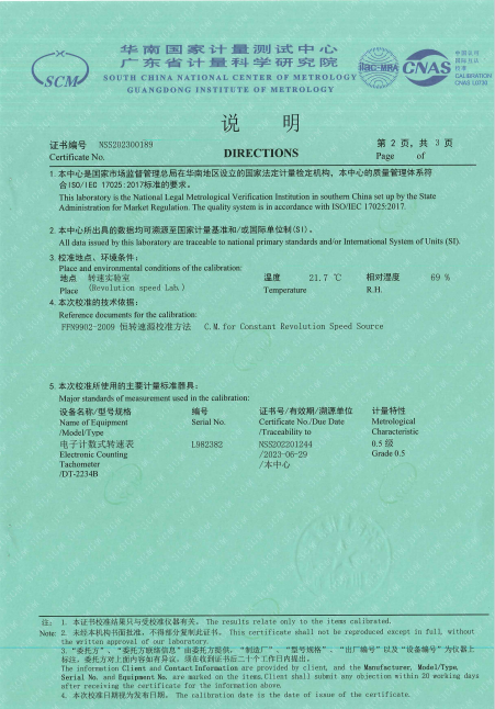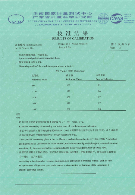 參照FFN9902-2009 恒轉(zhuǎn)速源校準(zhǔn)方法 C.M.for Constant Revolution Speed Source 檢定要求,CY3恒速器(恒轉(zhuǎn)速源)獲得NSS202300189檢定證書。