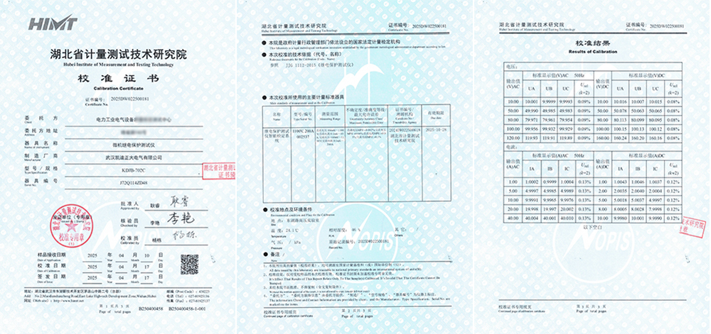 近日,電力工業電氣設備某中心采購的KDJB-702C微機繼電保護測試儀成功通過了湖北省計量測試技術研究院的嚴格校準,并順利獲得了校準證書。此采購標志著電力行業設備檢測單位對武漢凱迪正大電力產品的高度認可。