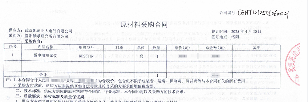 近日,洛陽軸承研究所有限公司經(jīng)過嚴(yán)格篩選與深入考察,最終決定采購信賴武漢凱迪正大,采購了KD2511N微電阻測試儀。此次合作不僅彰顯了客戶對武漢凱迪正大品牌的深度信賴,也驗(yàn)證了KD2511N微電阻測試儀在市場上的表現(xiàn)與廣泛認(rèn)可。